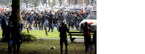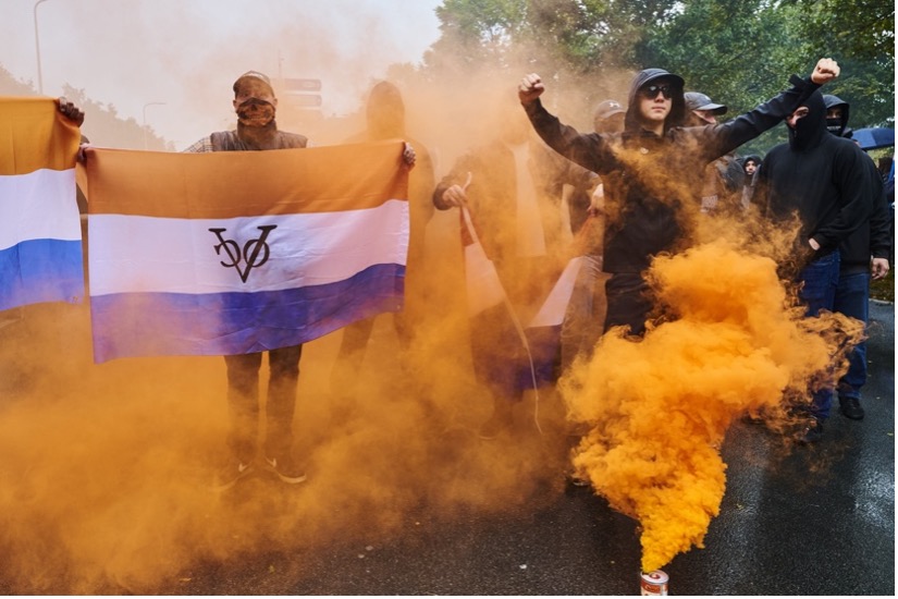 في الوقت نفسه، انتشر إعلان المظاهرة على وسائل التواصل الاجتماعي، وجذب انتباه جماعات اليمين المتطرف من جميع أنحاء البلاد، والذين حضروا أيضًا، ولكن لغرض مختلف. حملوا هراوات وعصيًا خشبية، وزينوا أنفسهم بالأعلام الهولندية، وعلم “ما يُسمى علم الأمير”، الذي استخدمه الحزب الفاشي الهولندي، الحركة الوطنية الاشتراكية، خلال الحرب العالمية الثانية، وهو علم يرمز إلى النازية. ردد حوالي 1500 متظاهر شغب شعارات ضد المهاجرين وطالبي اللجوء والمسلمين، واحتلوا طريقًا سريعًا، وأضرموا النار في سيارات الشرطة، وتوجهوا إلى البرلمان الذي كان يقع على مقربة من المظاهرة. وفي طريقهم، ألقوا الحجارة على نوافذ مكتب حزب سياسي يساري ليبرالي، مؤيد بشدة لأوروبا ويدعم سياسة لجوء منفتحة. بالنسبة للمتظاهرين، يمثل هذا الحزب الليبرالي اليساري كل ما يكرهونه. في النهاية، تدخلت الشرطة وشرطة مكافحة الشغب وأخرجت المتظاهرين من مركز مدينة لاهاي. أصيب ضابطا شرطة، وأُلقي القبض على 37 شخصًا.